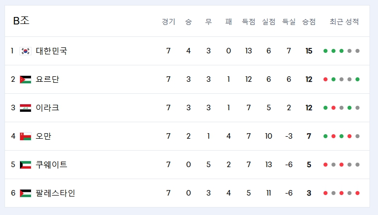 - 요르단 최근 전적: 3승 3무 1패 (평균 득점 2.15점, 평균 실점 0.77점)