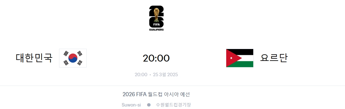 2026 북중미 월드컵 예선전이 한창 진행 중입니다. 대한민국 대표팀은 오는 3월 25일(화) 저녁 8시, 수원월드컵경기장에서 요르단과 월드컵 최종예선 중요한 일전을 펼칩니다. 대한민국 축구팬들이라면 절대 놓쳐서는 안 될 이 경기를 어디서 시청할 수 있는지, 대표팀의 현재 전력 상태는 어떤지 빠르게 정리했습니다.