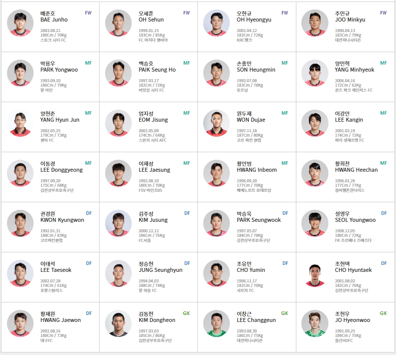- 백승호 (MF), 정승현 (DF), 김민재 (DF):