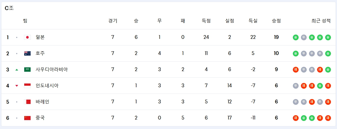 - 대한민국 최근 전적: 4승 3무 0패 (평균 득점 2.54점, 평균 실점 0.54점)