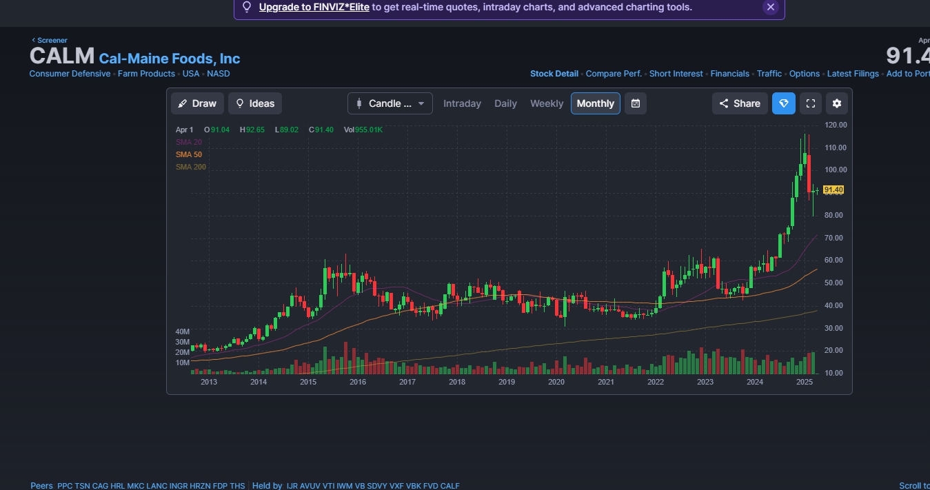 많은 투자자들이 고배당 종목에만 집중하다가, 배당은 줬지만 주가는 내리막인 경우를 자주 겪습니다. 하지만 제가 소개한 Finviz 고배당 성장 필터링 방식은 배당으로 단기 수익을 누리면서도 성장주처럼 자산 증식까지 노릴 수 있는 전략입니다. (위에서 소개한 CALM은 계란값에 연동되어 있어 장기적으로 가져가면서 배당 성장을 원하시는 분은 저가에 매수해야 하는 전략을 취해야 합니다)