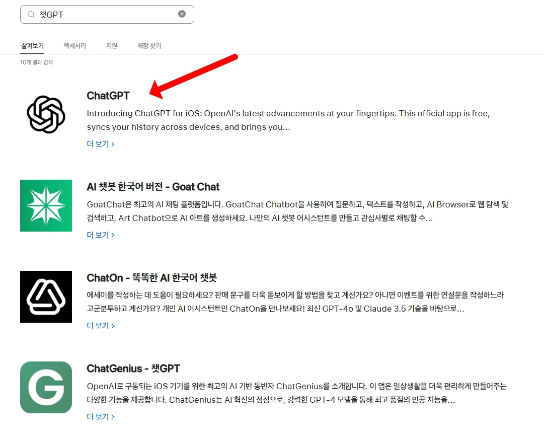 앱스토어에 'ChatGPT'를 검색하면 유사 앱이 수두룩합니다. 꼭 흰 바탕에 검정 꽃 아이콘의 '공식 OpenAI 앱'을 설치하세요. 광고 많은 앱은 혼란을 줄 수 있어요. 특히 무료 필터 사용 시 품질 차이를 느끼고 싶다면 정품 사용은 필수입니다.