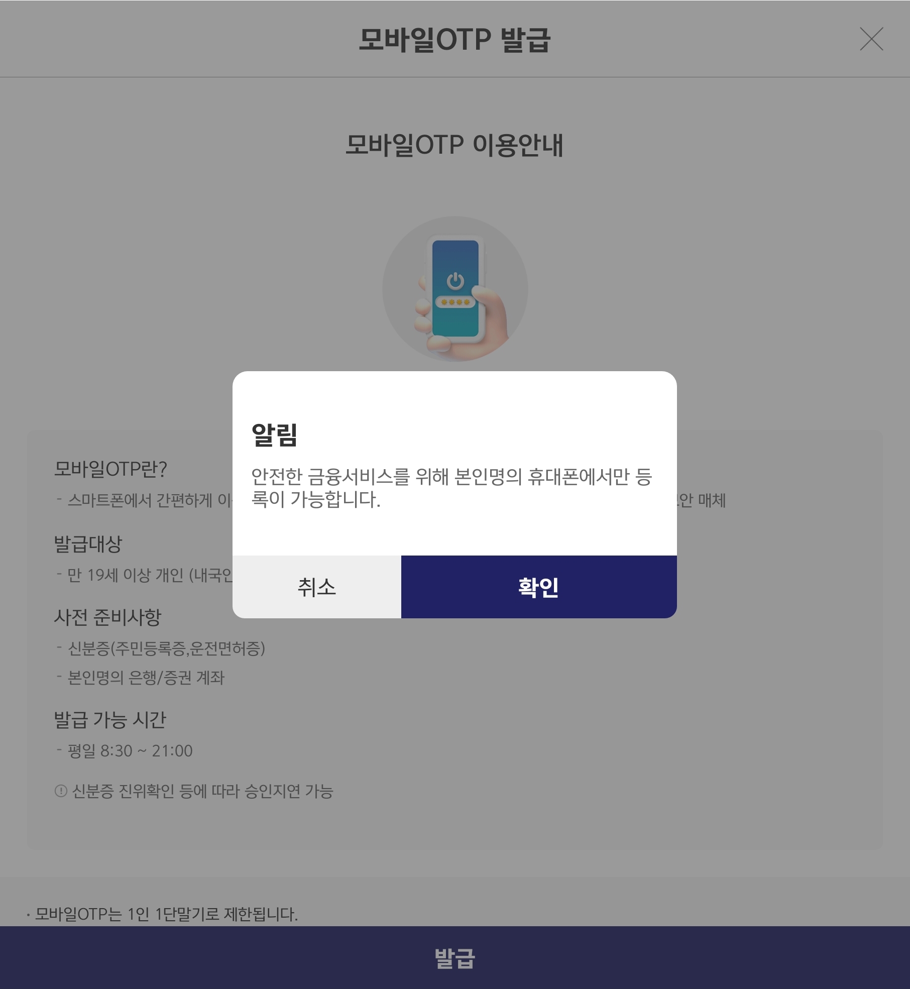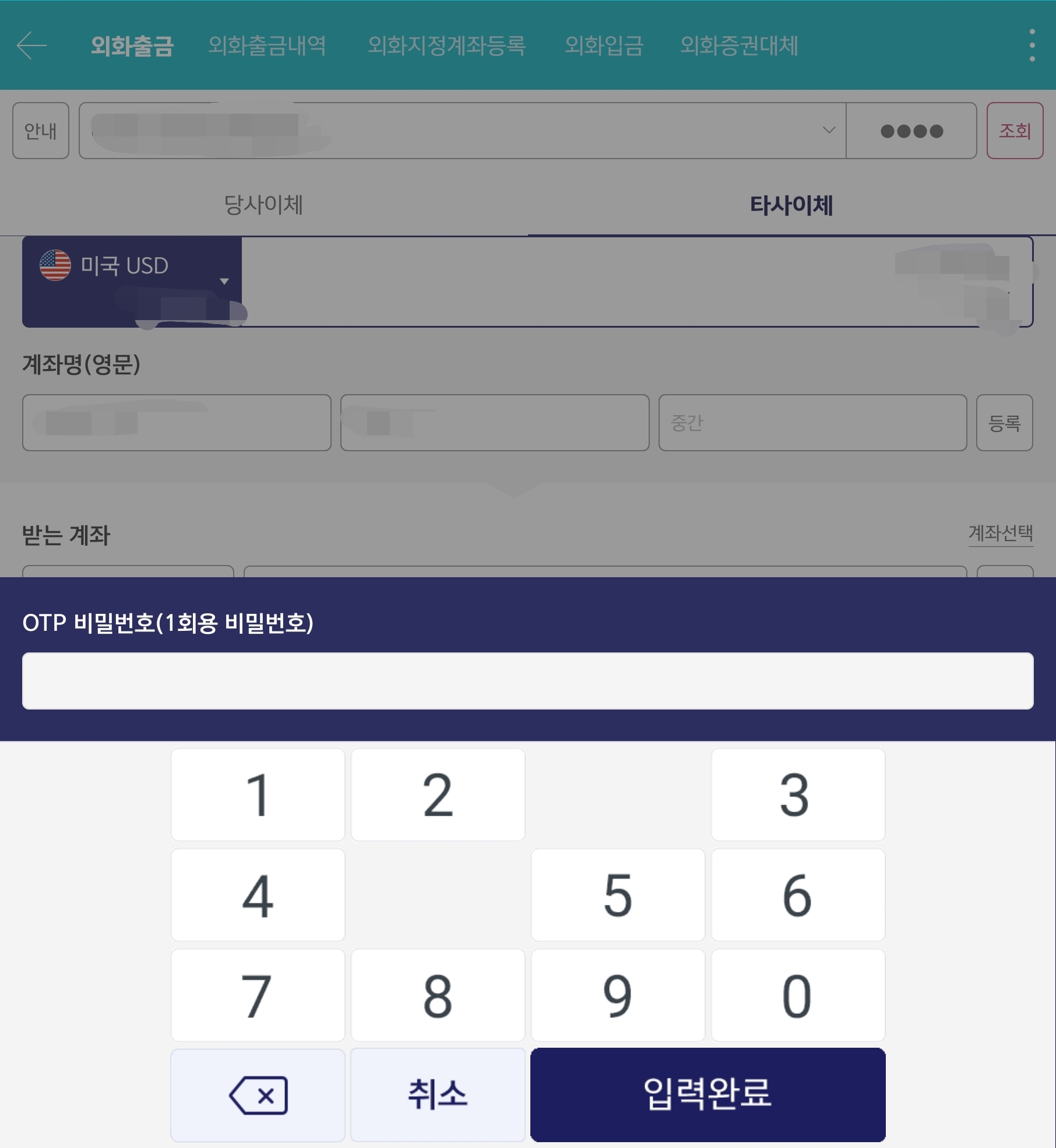 휴대폰 본인 인증을 하시면 신분증이 필요한데 처음 OTP 발급 시에는 몇 분 정도의 시간이 소요될 수 있습니다. 이후 OTP 번호를 입력해 주시면 외화 이체가 마무리 됩니다.