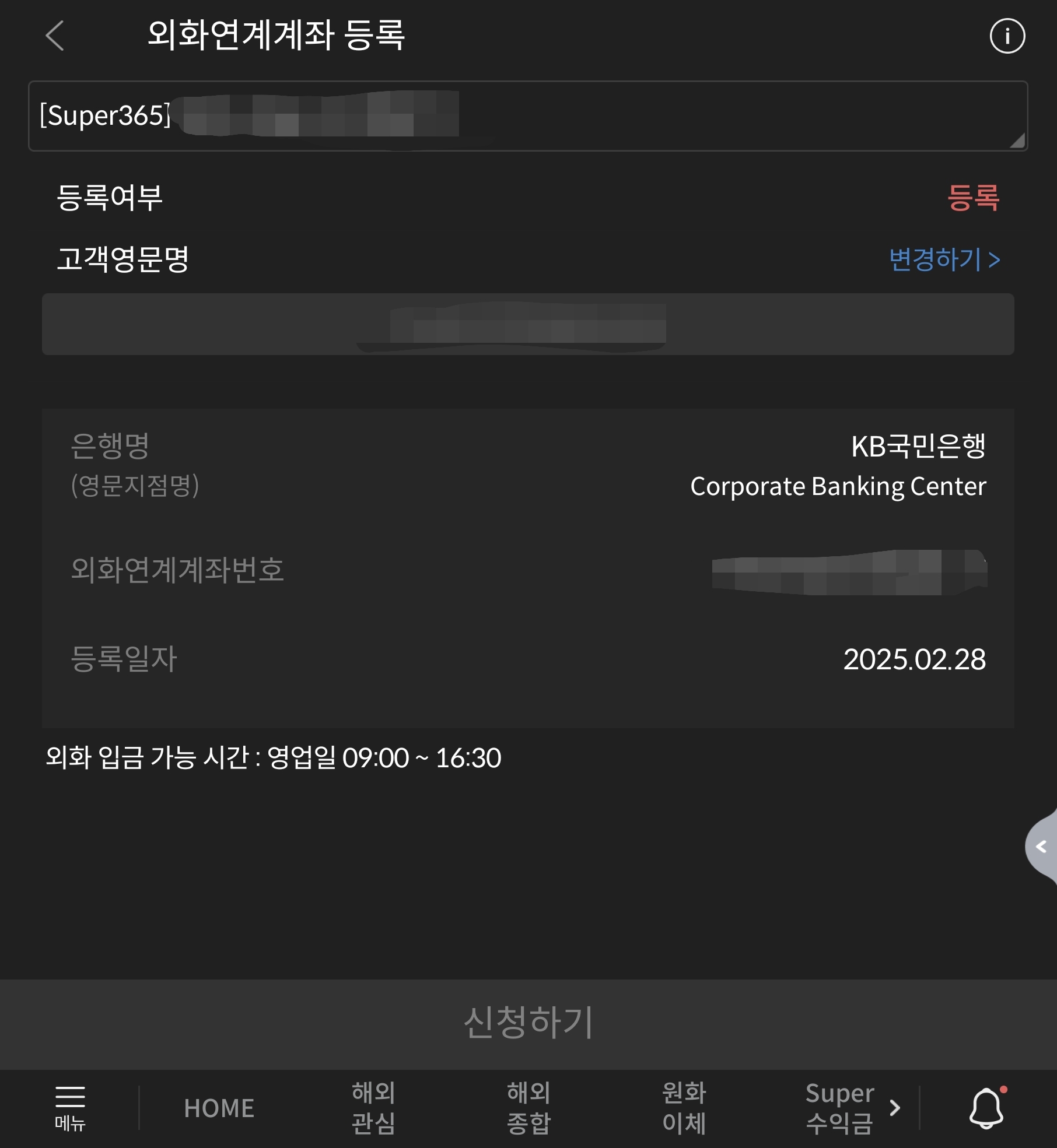 키움에서 외화이체를 하려면 외화 지정계좌를 등록해야 가능합니다. 영문으로 계좌명을 정확하게 입력 후, 메리츠 계좌 개설할 때 자동으로 발급된 국민은행 외환 계좌를 적어주세요.